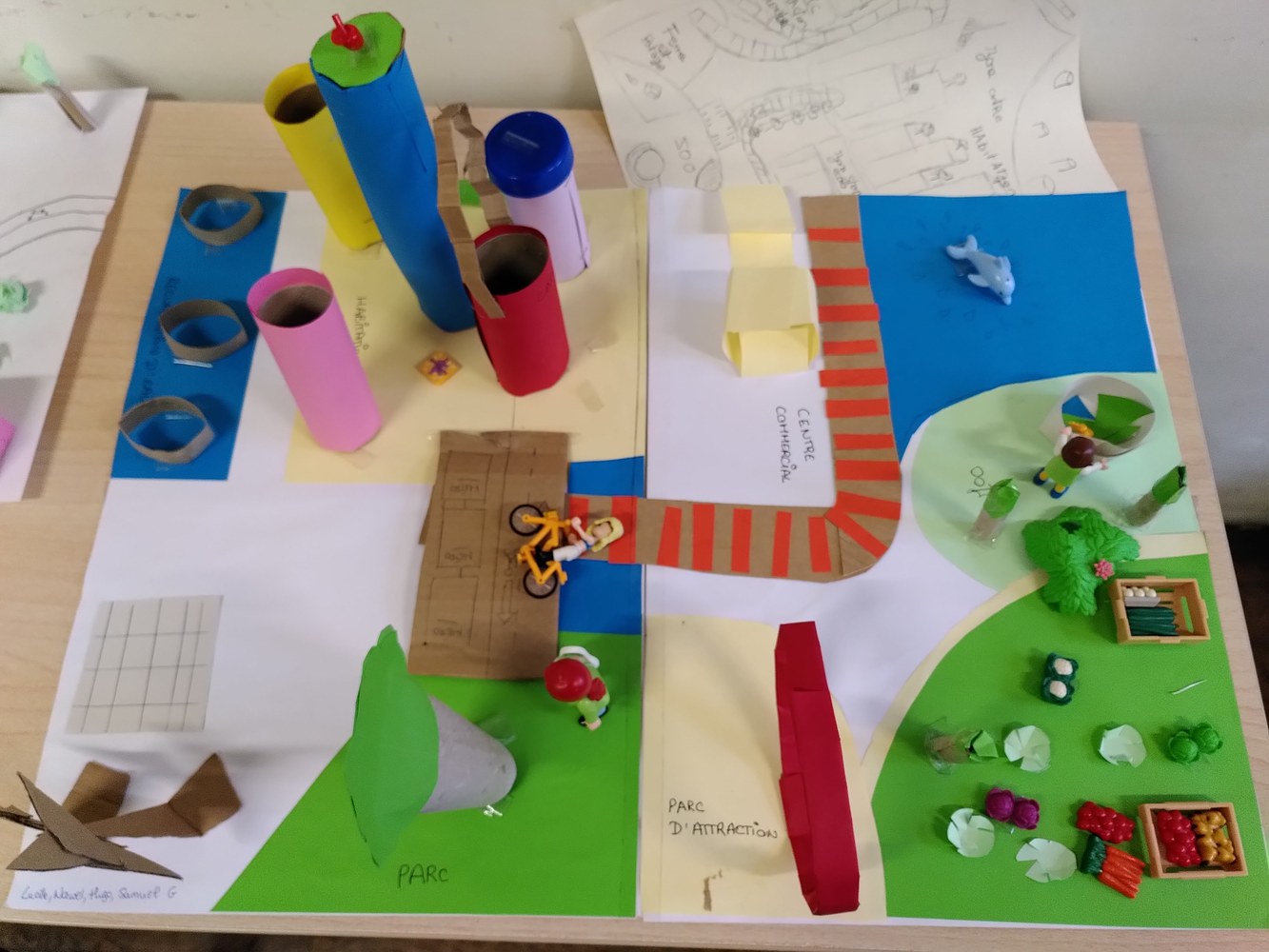 Dans le cadre du cours de géographie, les élèves doivent étudier le thème "habiter une métropole". Après avoir étudié ce qu'est une métropole, les élèves ont imaginé les solutions pour que la ville de demain soit moins polluante et plus agréable à vivre. Pour mettre en pratique leurs idées, ils ont donc conçu des maquettes de leur ville du futur, présentant des projets pour mieux se nourrir, mieux se loger, se déplacer, créer du lien entre les habitants et protéger l'environnement. Certains en ont profité pour utiliser des matériaux de récupération !